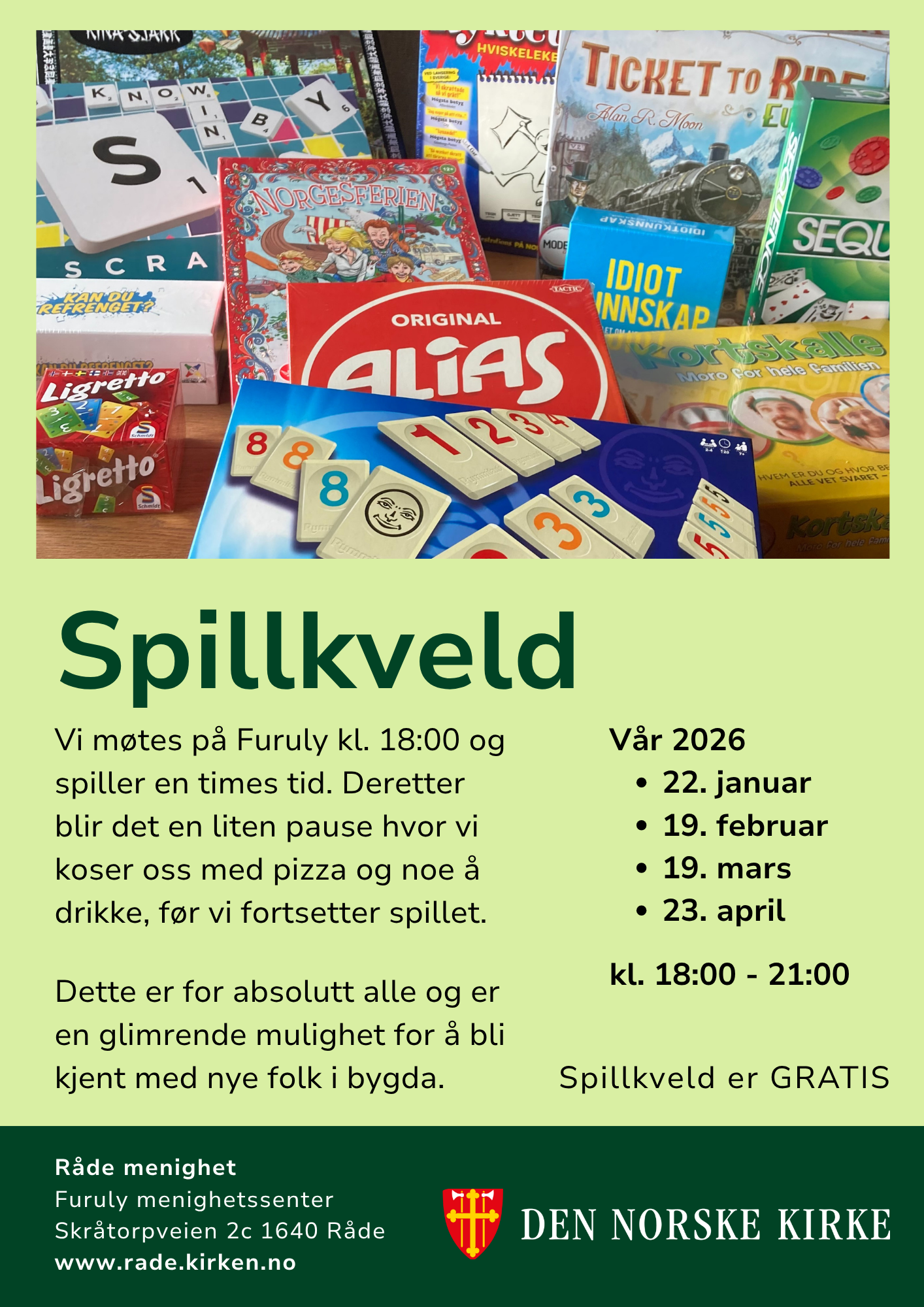 Velkommen til spillkveld på Furuly én torsdag i måneden kl. 18:00 - 21:00.