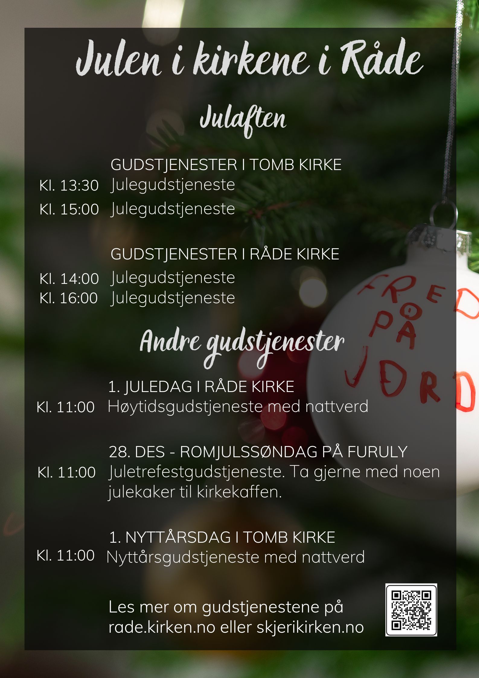 Gudstjeneste julaften ved prest Petter Løkkeberg og organist Børge Sandal. Råde Skolemusikkorps spiller før gudstjenesten. Vi synger kjente julesanger. Hjertelig velkommen!