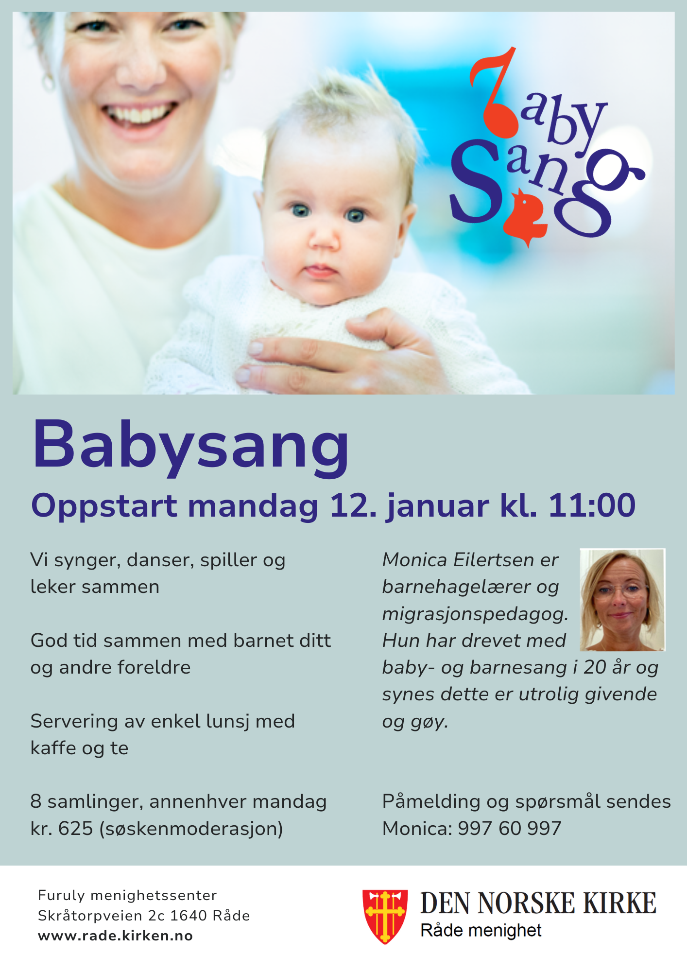 Du trenger ikke å flink til å synge for å være med -for ditt barn er din stemme det vakreste som finnes. Vi synger, bruker rytmeinstrumenter, lærer rim og regler. Etter babysangen avslutter vi med hyggelig lunsj i sofagruppen. Babysang på Furuly er fin møteplass for foreldre i Råde som er hjemme med baby. Vi har stellebord og det er god plass til barnevogner i gangen.