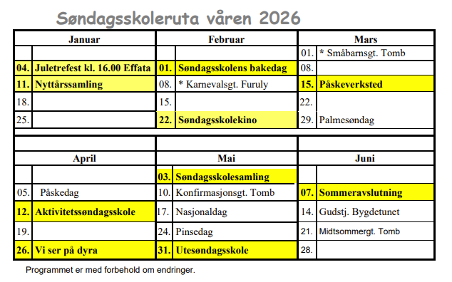 På søndagsskolen er det sang, skattekiste, bibelhistore, lek og aktiviteter. Noen ganger går vi ut eller drar på tur, ser på film, baker eller har aktiviteter i gymsalen.