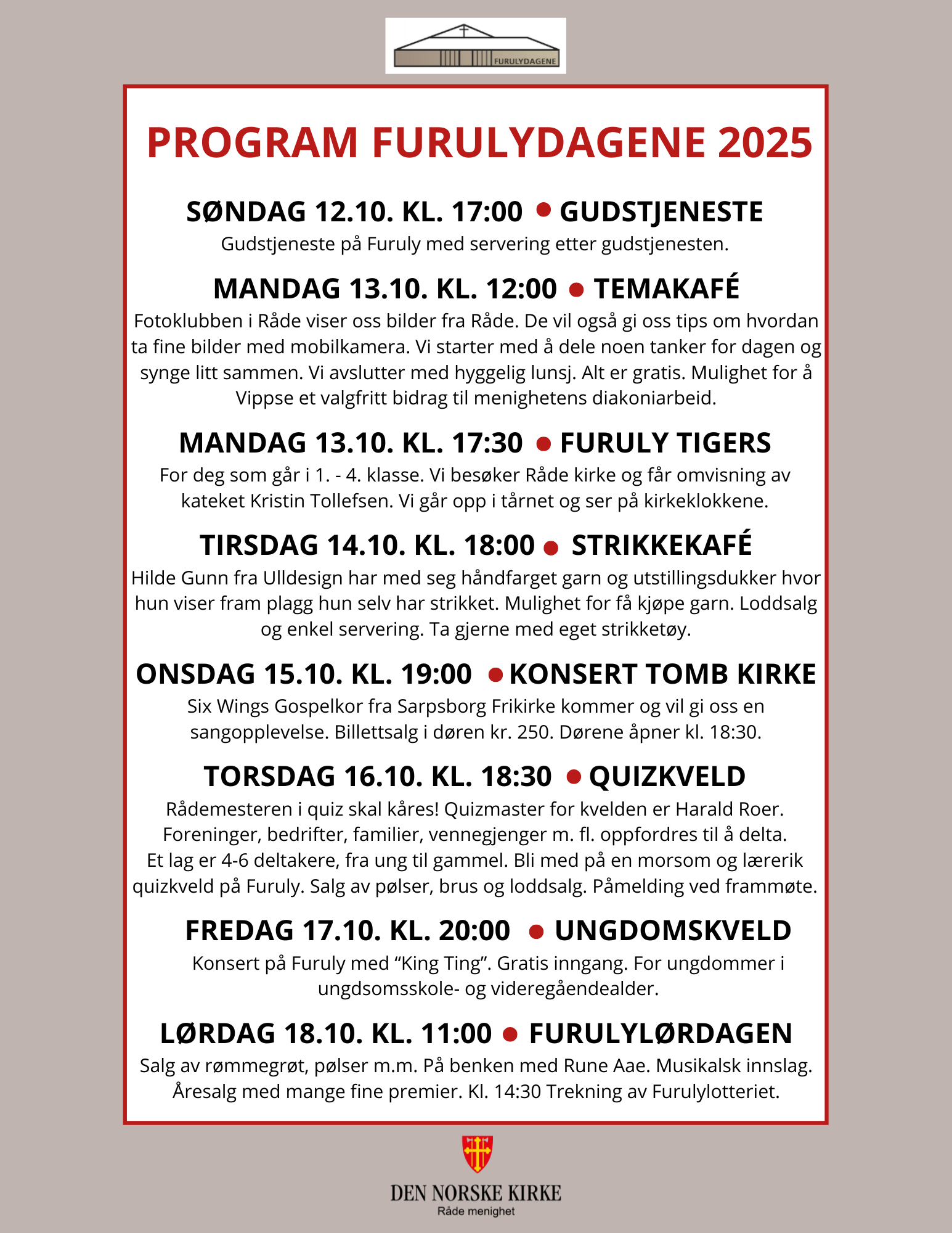 I uke 42 er det igjen klart for Furulydagene. Hver dag hele uken er det program med alt fra familiegudstjeneste, konsert til quiz m.m. Hele programmet finner du her.