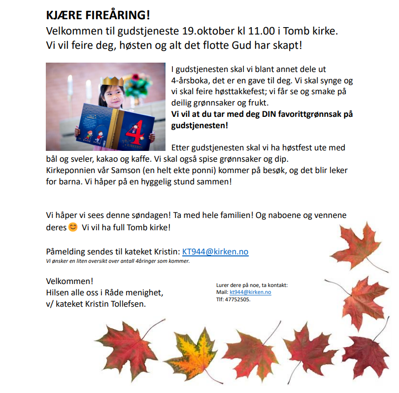 Velkommen til gudstjeneste og høsttakkefest! 19.oktober deler vi ut 4-årsboka til bygdas fireåringer. Etter gudstjenesten blir det høstfest ute med kirkeponnien Samson, sveler, bål og leker.